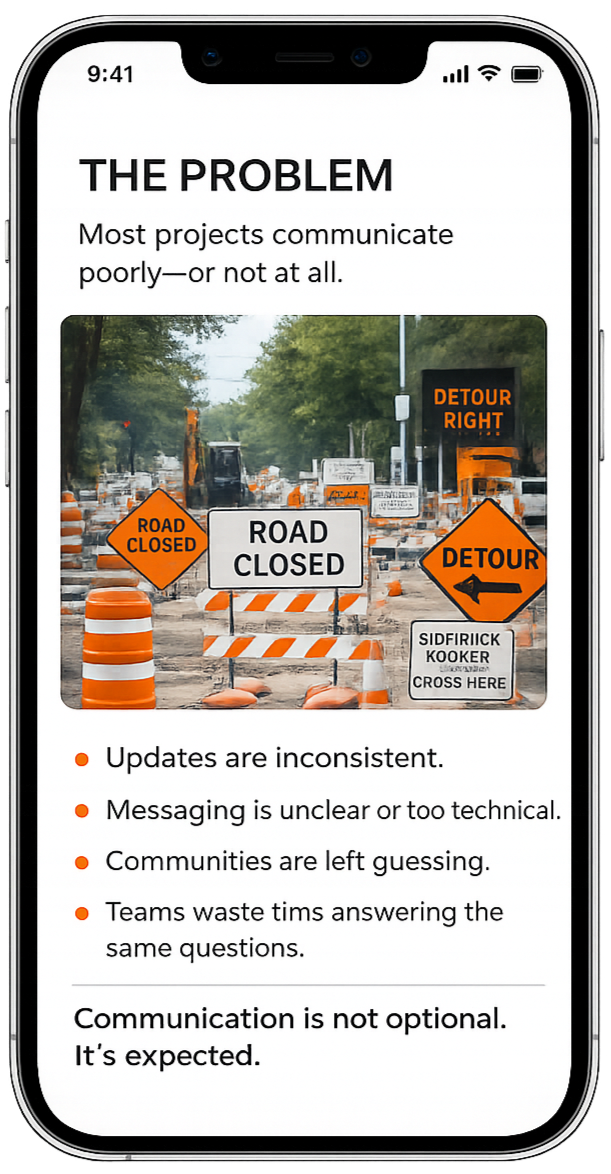 Road, utility, and development projectsIf your project requires regular updates to the public, stakeholders, or community—this is built for you.